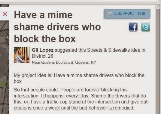 There's a website for Participatory Budgeting and if you live in one of the districts that has it, you might want to get your suggestions in. The one above, I assume, is tongue-in-cheek, but then again I can see Van Bramer tossing some money to Queens Council on the Arts for it.